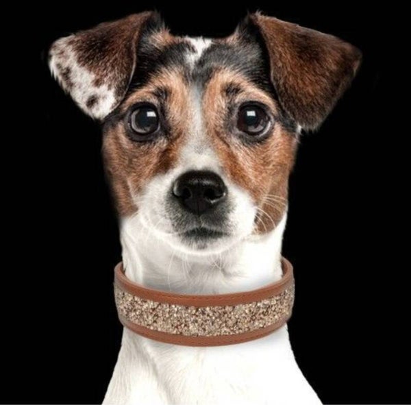 Trendy halsband in camel lederlook, versierd met kleine gouden/kopere strass steentjes.